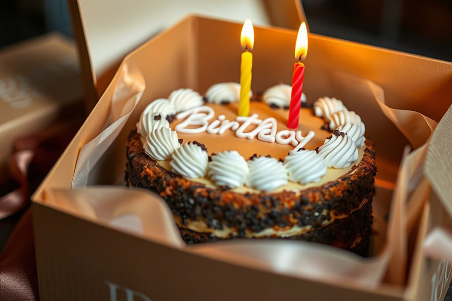 - Подарить на день рождения торт – тоже хорошая идея, если обставить её небанально. Торт можно приготовить самостоятельно или же заказать в кондитерской, а преподнести, поместив в большую коробку. Если торт не относится к фаворитам именинника, то есть другой вариант вкусного презента : коробку нужно заполнить печеньем, испечённым самостоятельно. Секрет в том, что в каждом печенье будет записка с предсказанием. Кстати, десерты можно приготовить самой разнообразной формы.